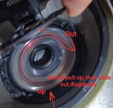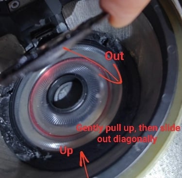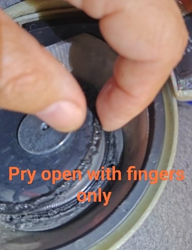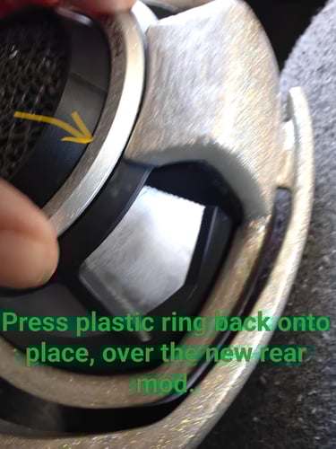 Easy Part. Just wiggle the back plastic ring off. Notice the rear metal grill is aligned with a notch at the frame alignment bump.. Remove the metal grill and replace with the new plastic mod piece, using the notch on the piece to same alignment bump on the frame.