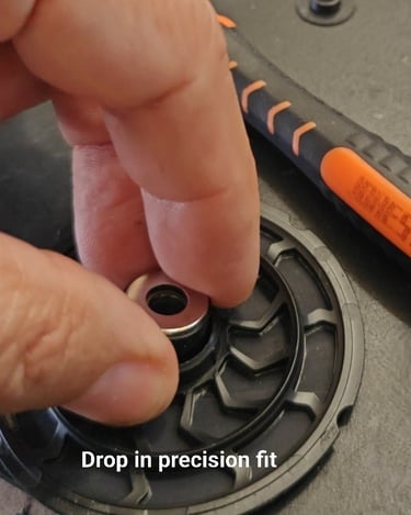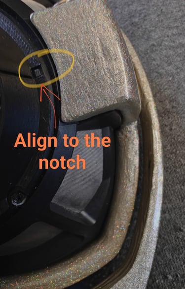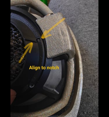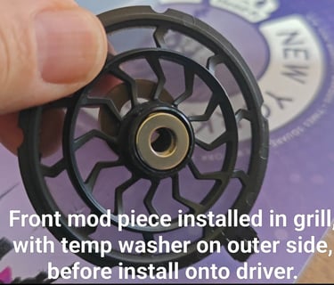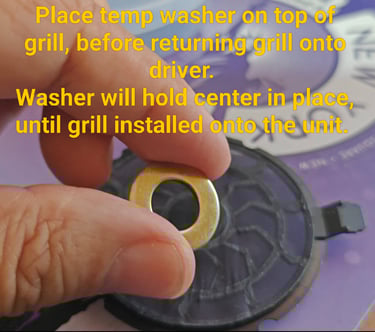 Push the piece with plastic side first, into the center of the grill, letting it stick out a tiny bit, than flush. Do not press this all way into the grill flush, as this piece will actually be resting inside bottom of driver.