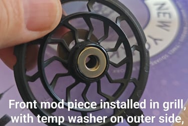 Once positioned in grill, we place a "temporary washer" (supplied) onto the other (outer/top) side of the grill.