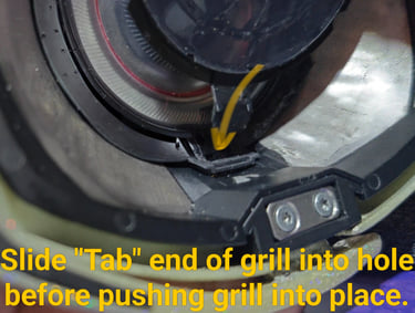 To reinstall grill, we carefully angle in the grill's tab edge first, into the plug side hole. The slowly lower the rest of the grill, while watching/aligning it with the screw holes, as we press it back into place..