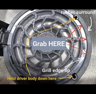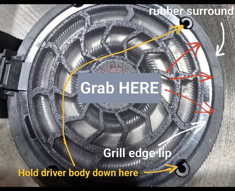 You can hold the driver down by the screw hole. Try with a plastic tool like a Q-tip, into the screw hole, to hold the driver down. Start prying up the grill by its edge lip, at opposite side from the plug side. You must have enough fingernails to safely catch the edge, so you are only using your fingers to gently lift and grab, for safety.