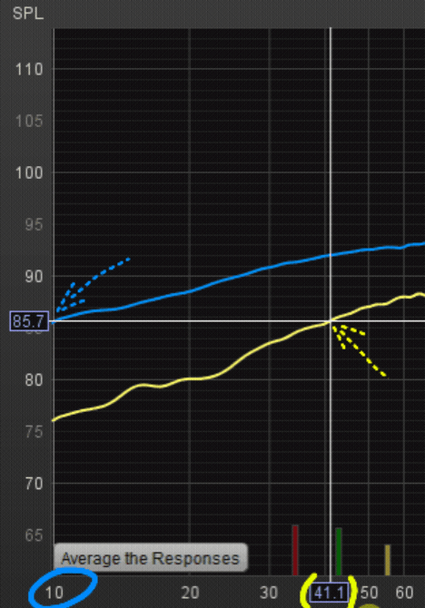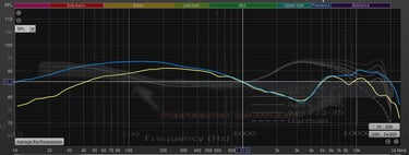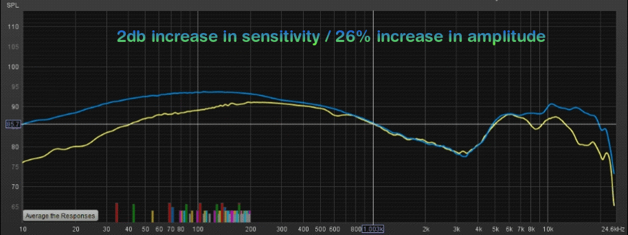 The yellow line is a stock version, and the blue line is the new “Centro Force” Frequency Response. Each line is 1db, for easy counting.
