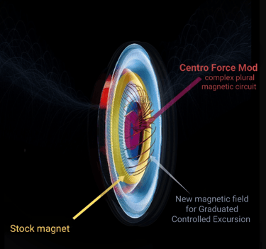 1- First, the Ground breaking new implementation The internal “Trinity core”. Plural magnetic elements, combining triple magnetic field structures into “unified core” of varied intensity, according to the driver’s excursion.