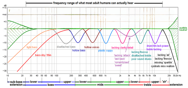 Having large dips "outside" of the ear’s sensitivity area (midrange) causes a more perceptive loss in music information.